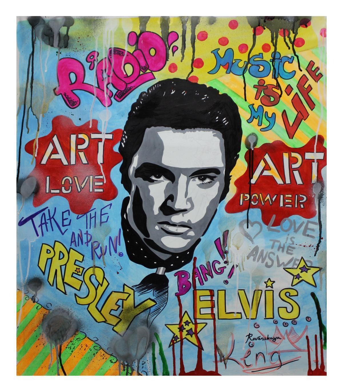 Artist: Nastya Rovenskaya. Medium: Original Oil on Canvas. Title: Time For Elvis . Size (Unframed): 30" x 24". Certificate of Authenticity: From the publisher. Additional: Only one of a kind. Reference# 11246.
