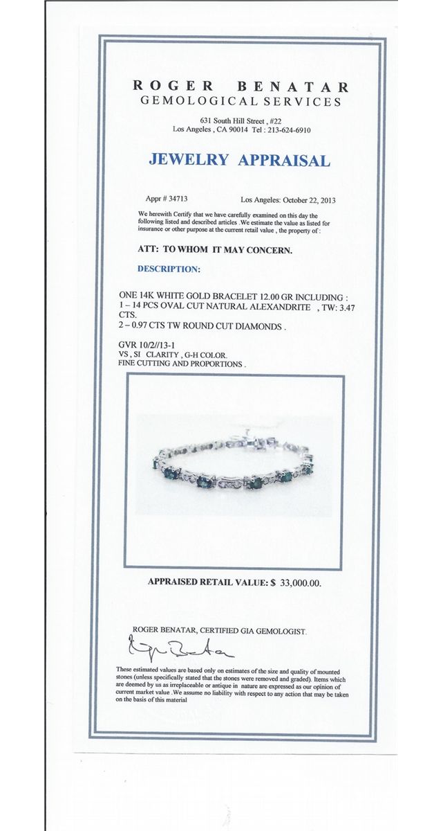 14kt white Gold 12.00 Approx grams including, 14 pcs Oval Alexandrite .97cttw Round Diamond G-H color VS-SI clarity, Appraised Retail Value$33,000.00
