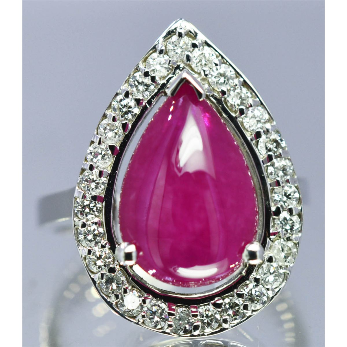 14kt White Gold 5.69 Approx grams including, 5.60ct Cabochon Ruby Pear Shape Deep Red Great Cut, .55cttw Round Diamond G-H color VS-SI clarity, size 6.5, Estimated Value $19,500.00, Appraisal will be included upon purchase
