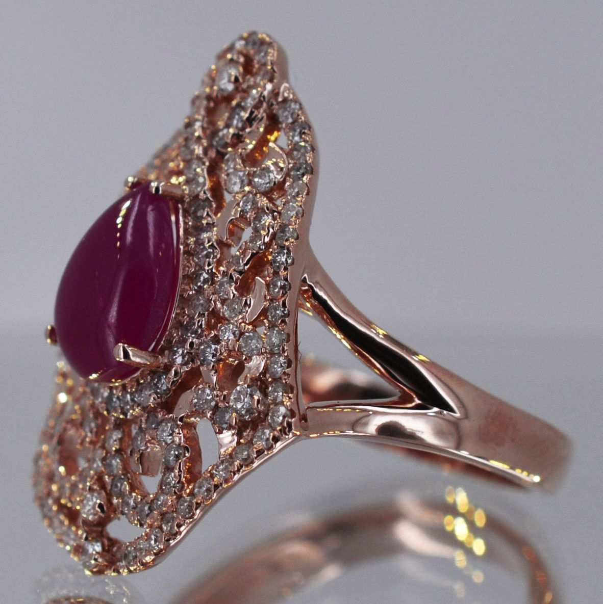 14kt Rose Gold 6.55 Approx grams including, 2.26ct Pear Shape Cabochon Ruby, .93cttw Round Diamond G-H color VS clarity, Apprasied Retail Value $12,000.00