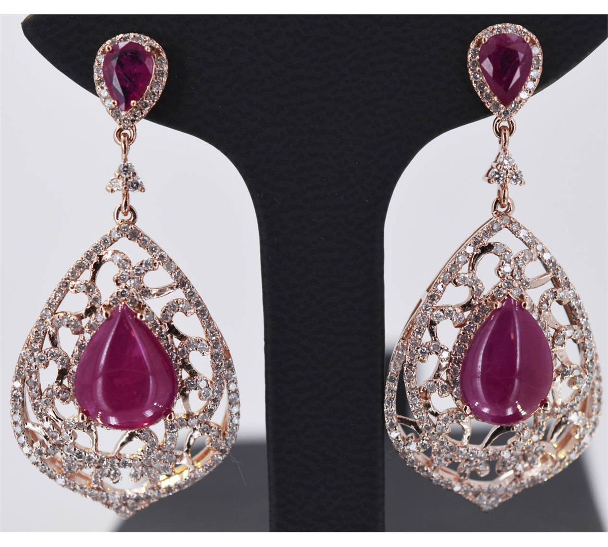 14kt Rose Gold 11.79 Approx grams including, 11.60cttw Pear Shape Cabochon Ruby, 2.47cttw Round Diamond G-H color VS clairty, 1.48cttw Pear Shape Faceted Ruby, post backs, Appriased Retail Value $24,000.00
