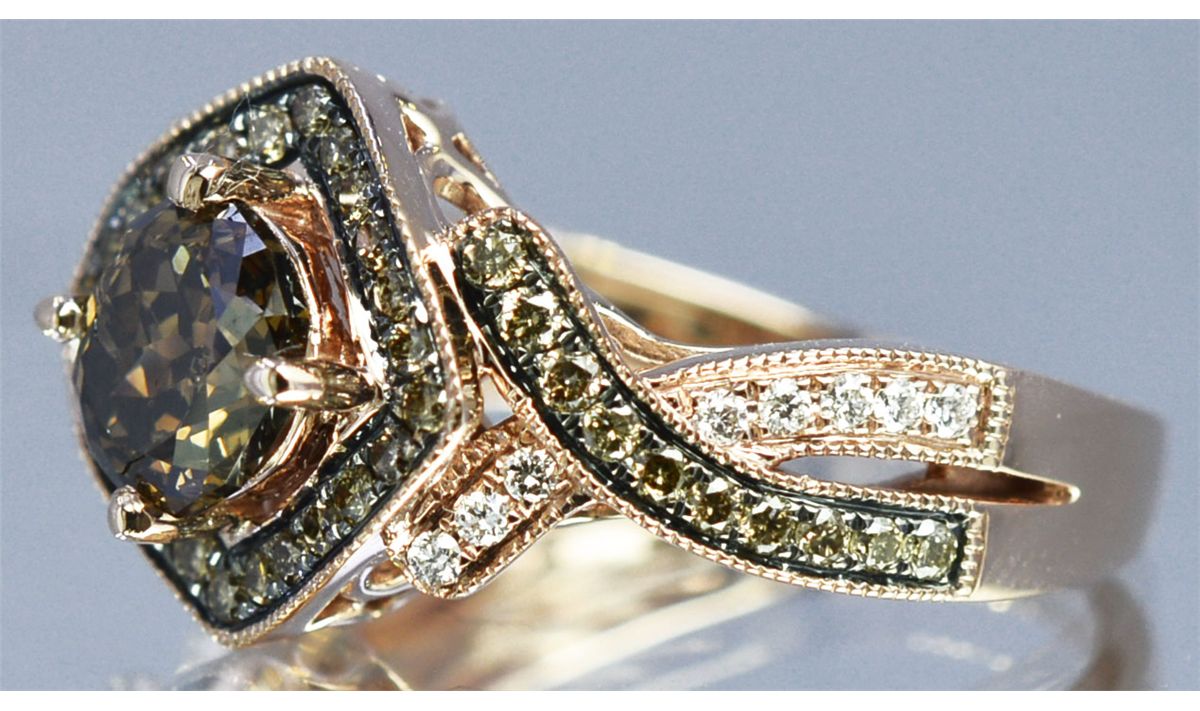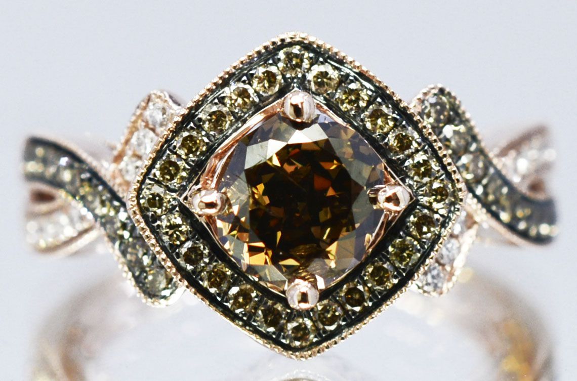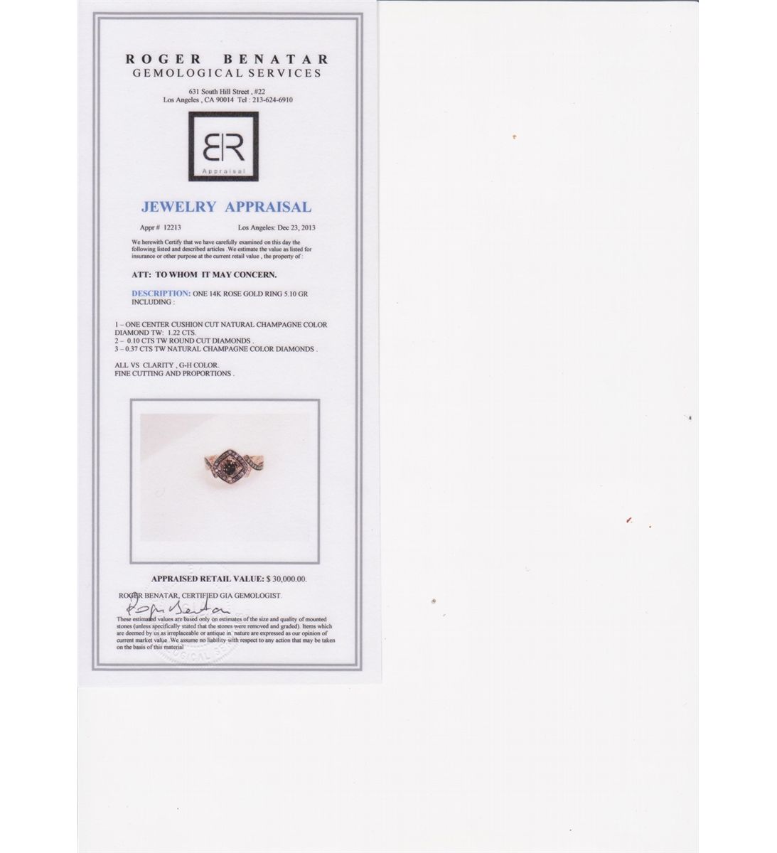 14kt Rose Gold 5.10 Approx grams including, 1.22ct Center Cushion Cut Champangne Diamond, .10cttw Round Diamond G-H color VS clairty, .37cttw Nat Champagne Diamond, Appraised Retail Value $30,000.00
