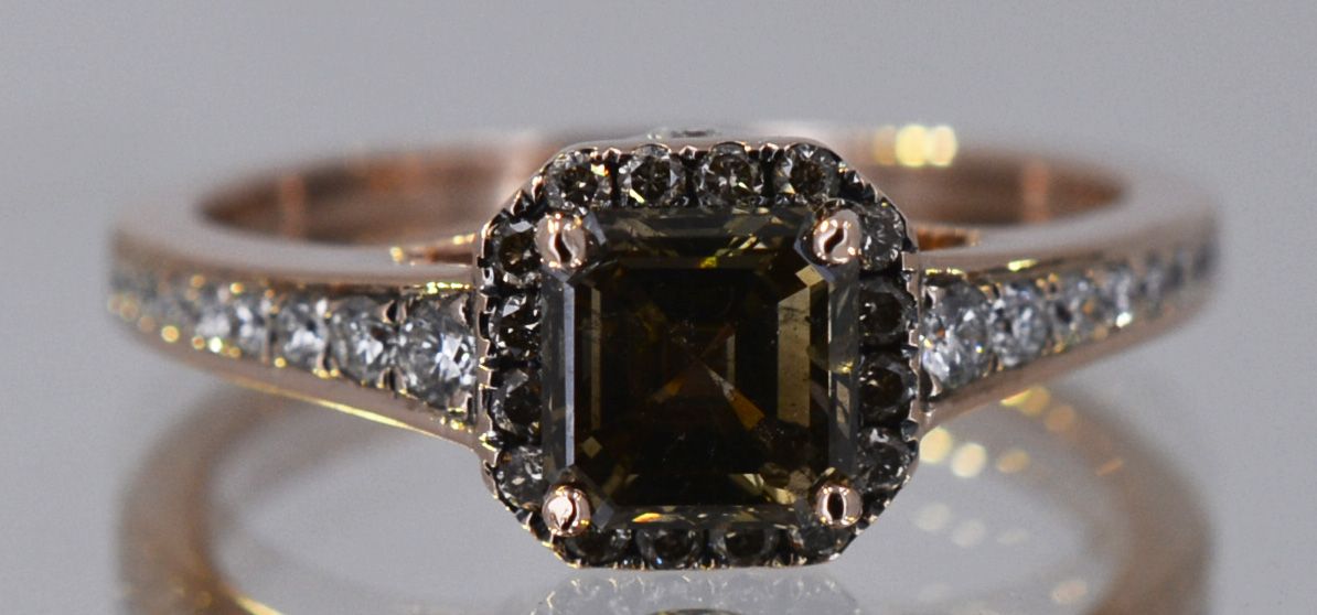 14kt Rose Gold 3.30 Approx grams including, .95ct Center Asher Cut Nat. Champagne Diamond, .22cttw Round Diamond G-H color vs clarity, Appraised Retail Value $30,000.00