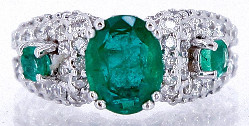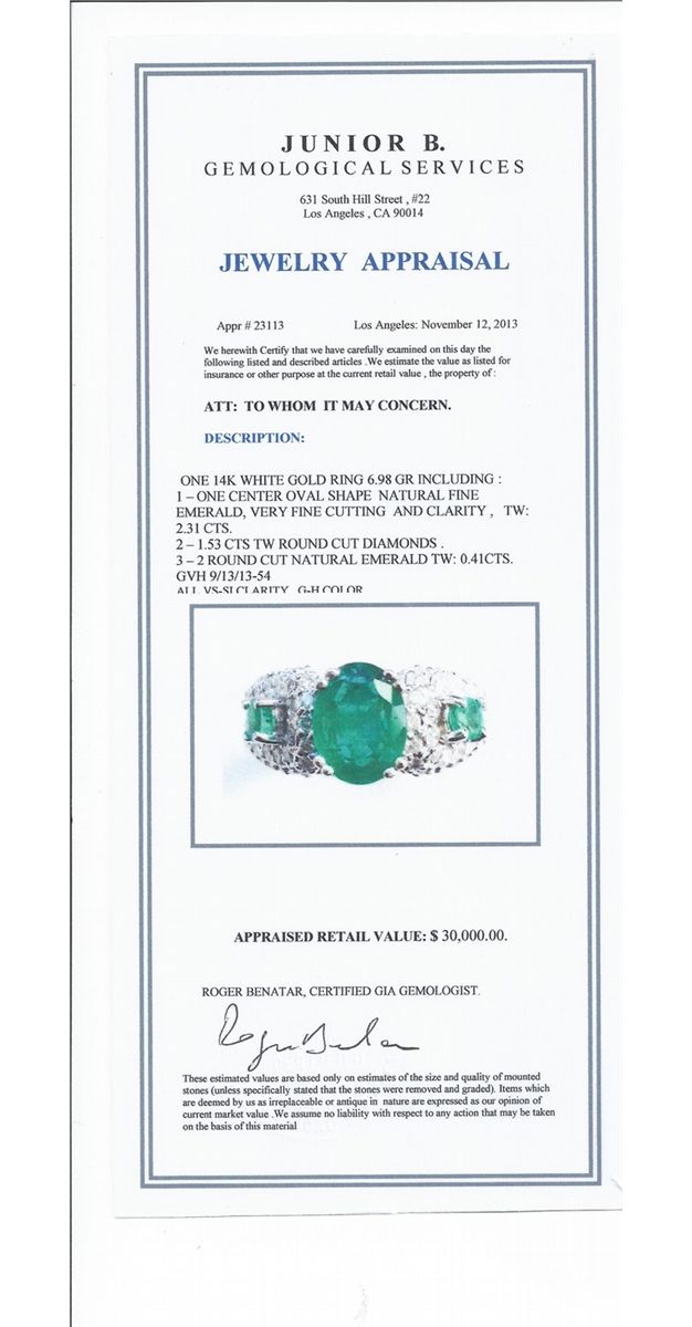 14kt White Gold 6.98 Approx grams including, 3 stones emerald center 2.31ct Oval, .41cttw 2 Round side stones, 1.53cttw Round Diamond G-H color VS-SI clarity, size 7.25 Appraised Retail Value $30,000.00