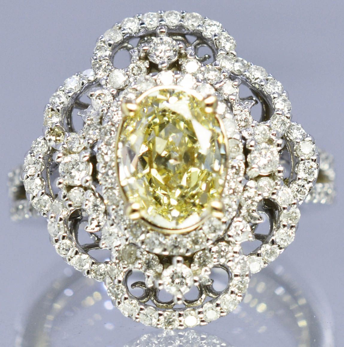 14kt T/T White And Yellow Gold 7.09 Approx grams including, 1.70ctw Nat Fancy Yellow Diamond Oval Cut Excellent Cutting and Clarity, 1.70cttw Round Diamond G-H color VS-SI clarity, vary elegant piece, Appraised Reatil Value $45,000.00