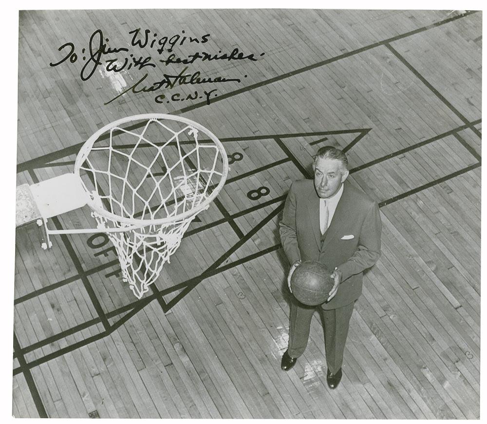 One of basketball’s most important innovators (1896–1995). Playing most of his career with the Original Celtics, Holman's extraordinary skills, a deft passer and brilliant floor leader, were innovative for the era, and made the Celtics virtually unbeatable. While barnstorming with the Celtics, Holman also handled the duties of coaching City College of New York. Vintage glossy 8.25 x 7.25 photo of Holman on a basketball court, signed and inscribed in fountain pen “To: Jim Wiggins, with best wishes, Nat Holman, C.C.N.Y.” Trimmed edges, a few creases, and several spots to emulsion, including one over facial area, otherwise fine condition.