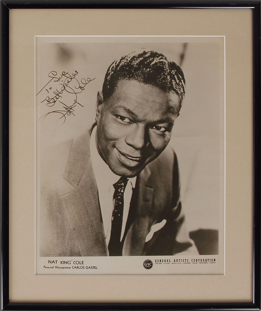 Vintage glossy 7.75 x 9.75 General Artists publicity photo of Cole, signed and inscribed in fountain pen, “To Sue, Best Wishes, Nat King Cole.” Matted, framed, and in fine condition.