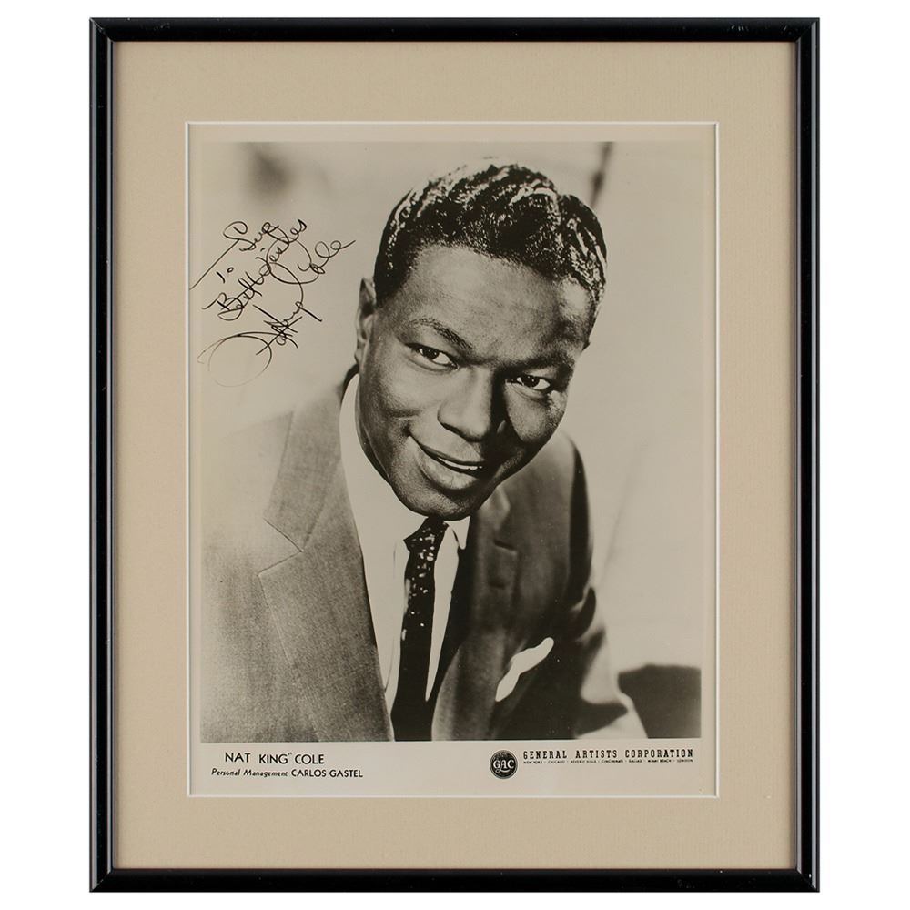 Handsome vintage glossy 7.75 x 9.75 General Artists Corp. publicity photo of Cole, signed and inscribed in fountain pen, "To Sue, Best Wishes, Nat King Cole." Matted and framed to an overall size of 10.75 x 12.75. In fine condition.
