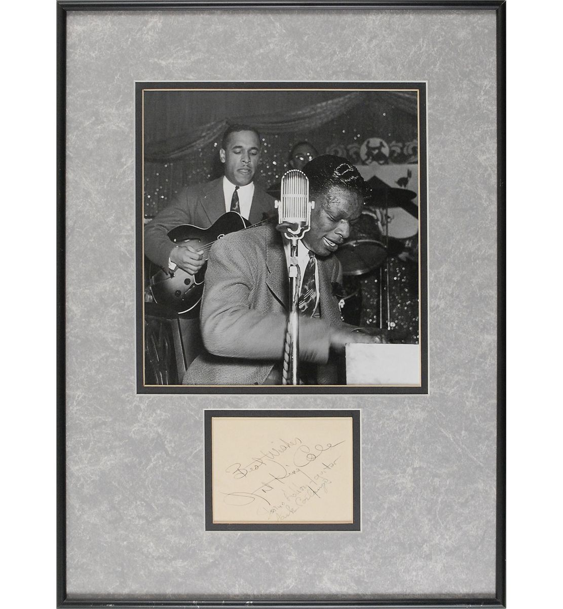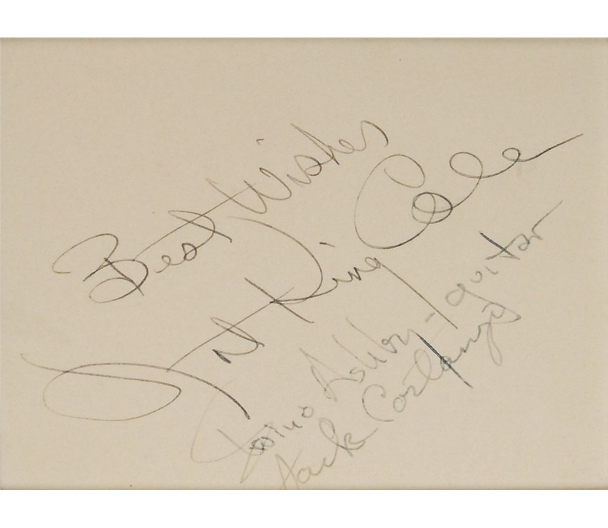 Vintage fountain pen signatures, “Best wishes, Nat King Cole,” “Irving Ashby–guitar,” and “Jack Costanzo,” and on an off-white album page. Double-matted and framed with a photo of the trio on stage to an overall size of 13.25 x 17.75. In fine condition.