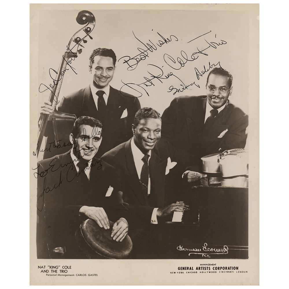 Vintage glossy 8 x 10 agency photo of Nat King Cole and his 'Trio,' signed in fountain pen by Nat King Cole, Irving Ashby, Joe Comfort, and Jack Costanzo. In very good to fine condition, with scattered creasing, and a short tear to the left edge.