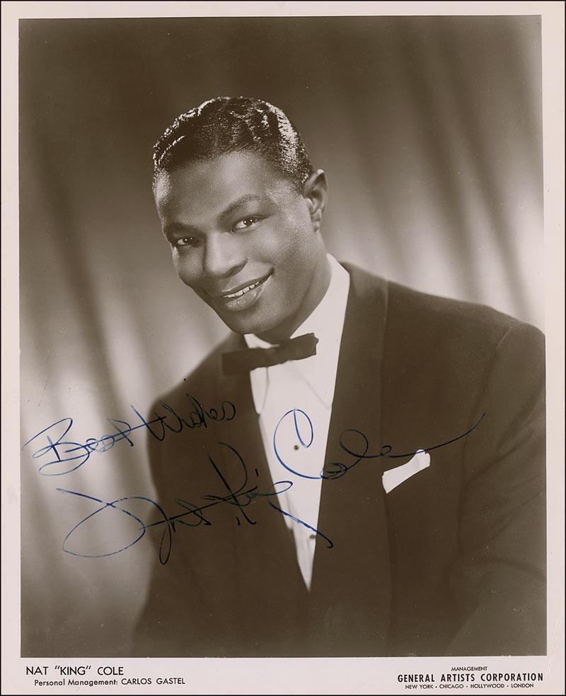 Vintage glossy 8 x 10 publicity photo of the formally-clad Cole, signed in fountain pen. In fine condition, with some scattered light creases and surface marks, and a bit of irregular ink adhesion to signature and sentiment.