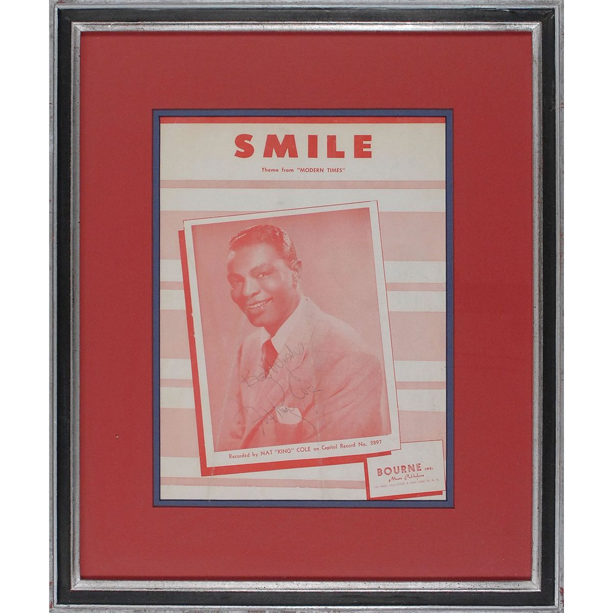 Sheet music for ‘Smile,’ featuring an image of Cole on the front cover, 8.75 x 11.5, signed in fountain pen, “Best Wishes, Nat King Cole.” Nicely double-matted and framed to an overall size of 15.75 x 18.75. In very good condition, with a couple diagonal folds (one passing through the final letter of the signature), and mild overall creases.