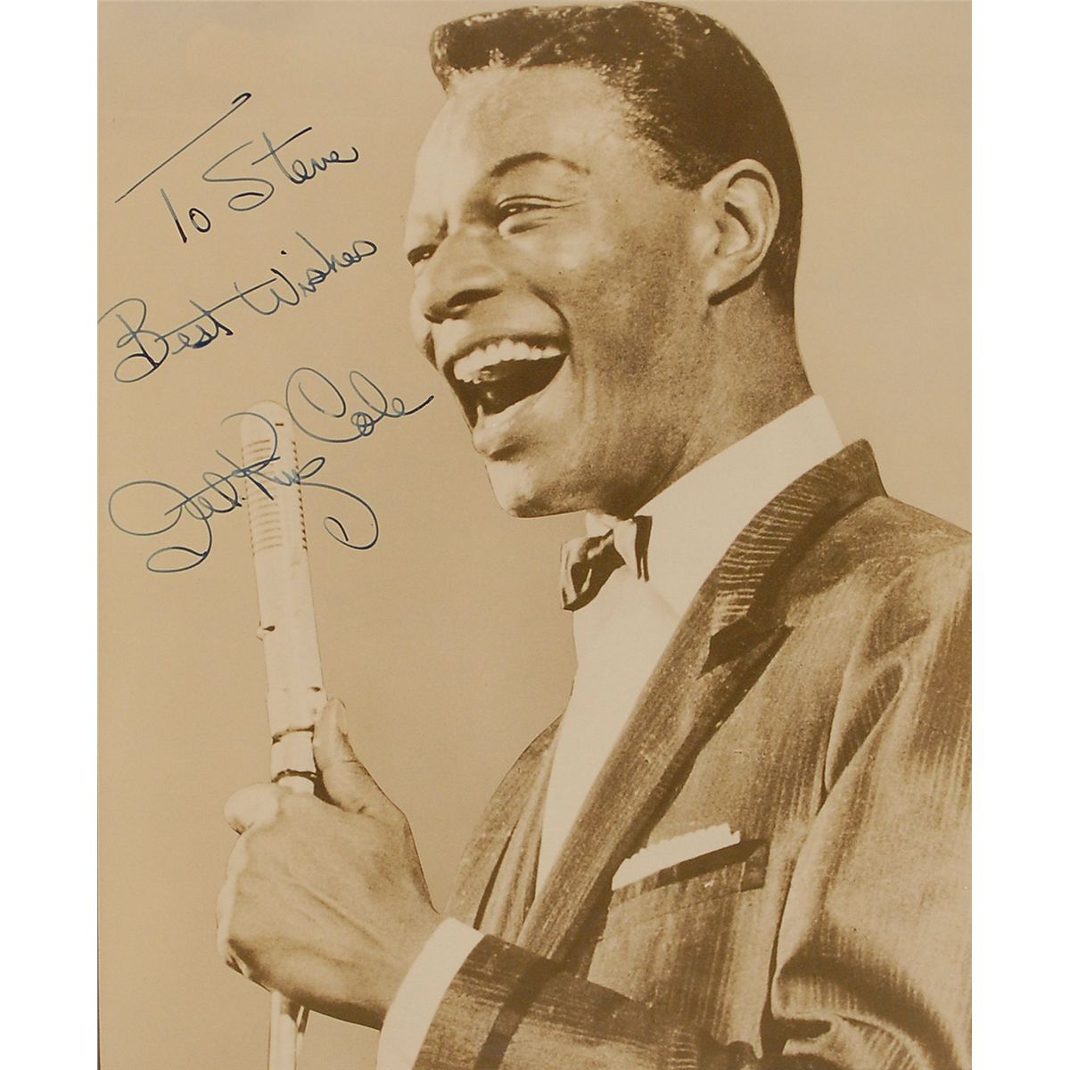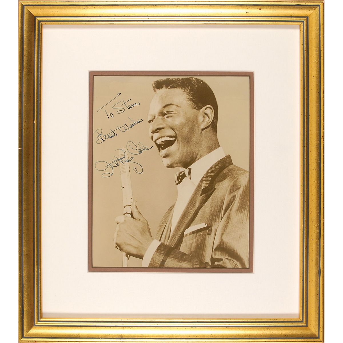 Superb vintage glossy 7 x 9 photo of Cole singing into a microphone, prominently signed and inscribed in fountain pen, “To Steve, Best wishes, Nat King Cole.” Expertly double-matted and framed to an overall size of 14 x 15.5. In fine condition.