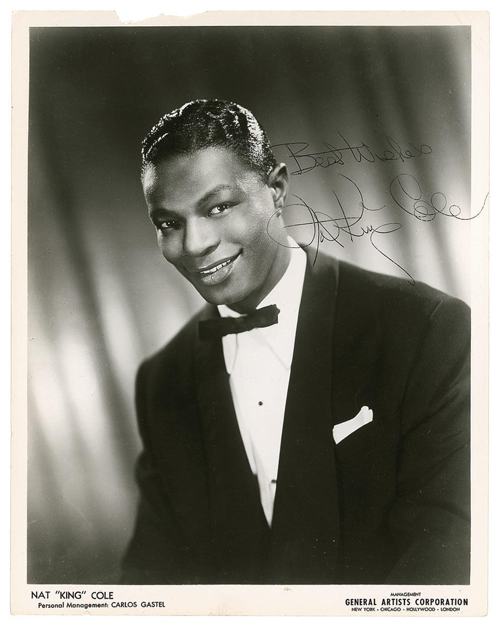 Vintage glossy 8 x 10 publicity photo of Cole in a tuxedo, signed in black ballpoint, “Best Wishes, Nat King Cole.” In fine condition, with scattered light surface creases and an area of missing paper from the top border.