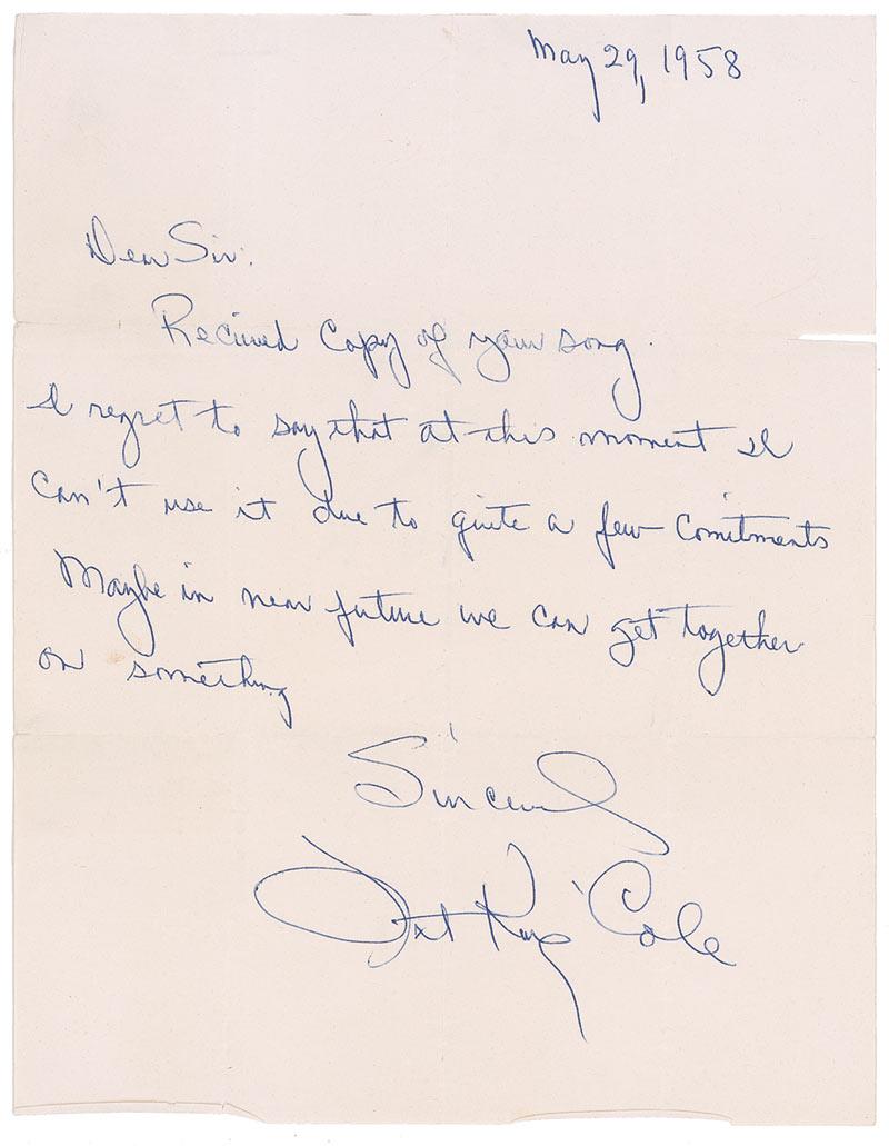 Rare ALS, one page, 8.5 x 11, May 29, 1958. Letter to an unidentified gentleman passing on a song opportunity. In full: “Received copy of your song. I regret to say at this moment I can’t use it due to quite a few comitments [sic]. Maybe in near future we can get together on something.” In very good condition, with intersecting folds, two through single letters of signature, a couple small fold separations, and scattered light creases and wrinkles.