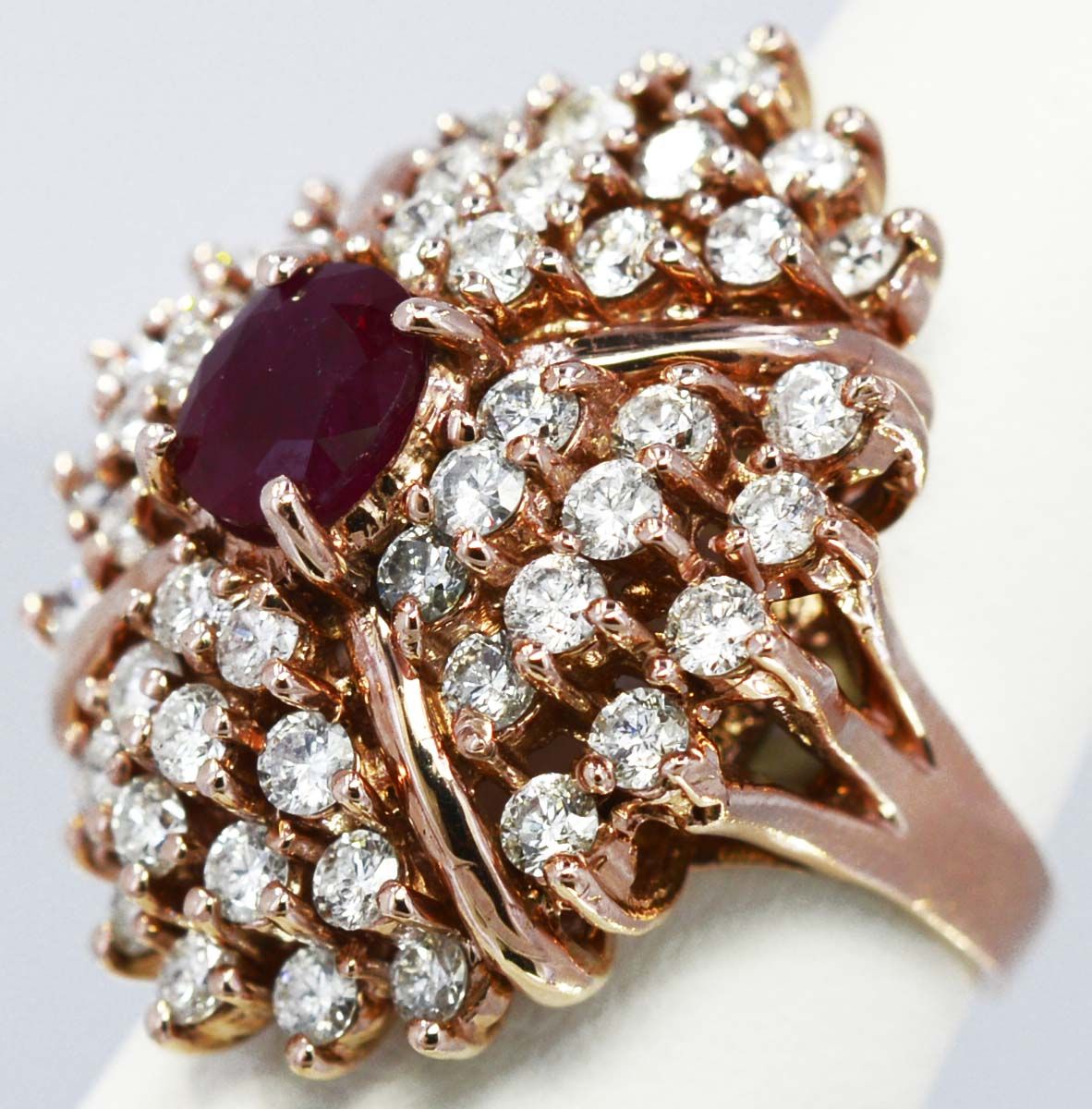 14kt Rose Gold 16.14 Approx grams including, 1.79ct Nat. Ruby Oval (Burma color), 3.28cttw Round Diamond G-H color VS-SI clarity, size 7.25 Appraised Retail Value $18,000.00