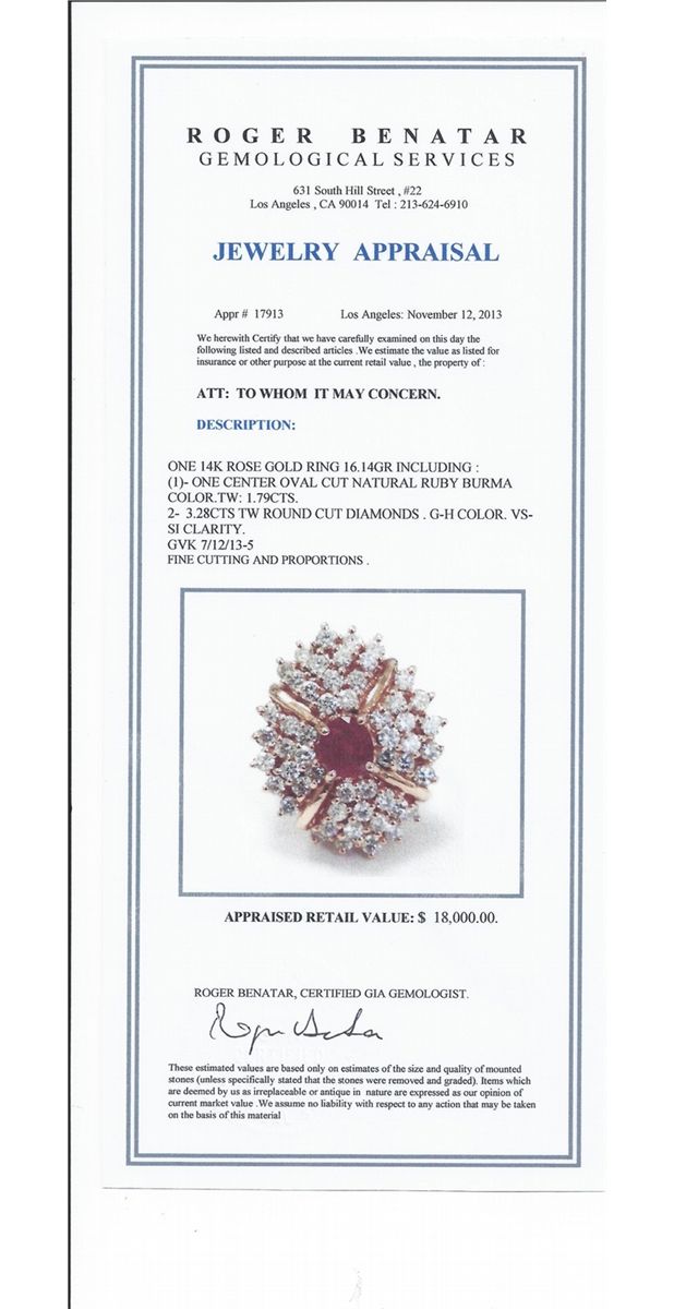 14kt Rose Gold 16.14 Approx grams including, 1.79ct Nat. Ruby Oval (Burma color), 3.28cttw Round Diamond G-H color VS-SI clarity, size 7.25 Appraised Retail Value $18,000.00