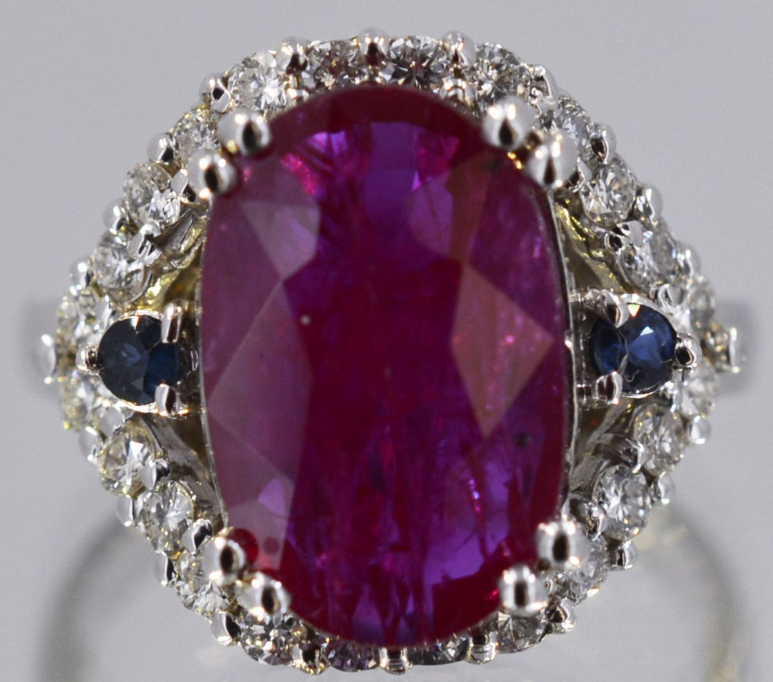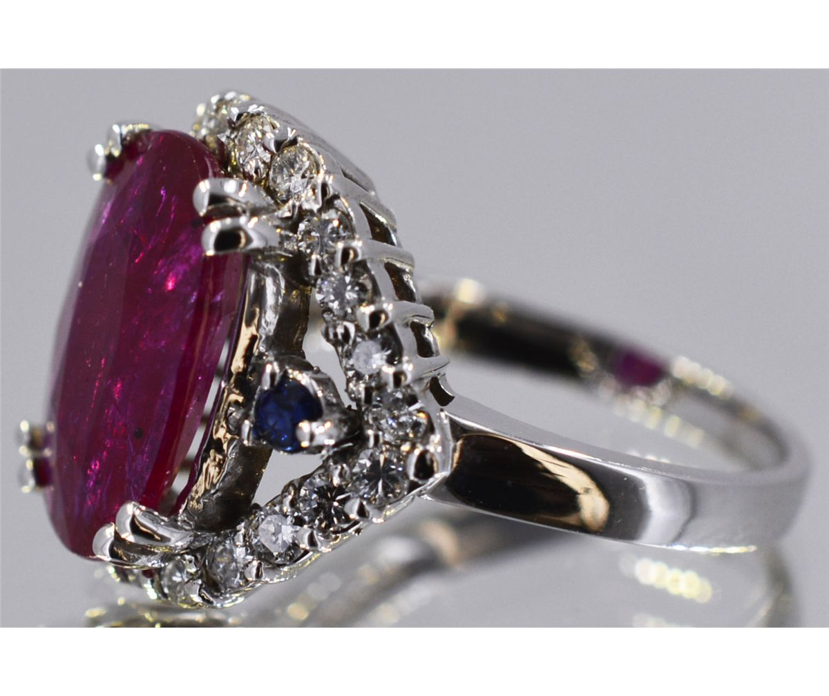 14kt White Gold 4.97 Approx grams including, 4.85ct Ruby Oval cut, .12cttw Round Blue Sapphire, .60cttw Round Diamond G-H color VS-SI clairty, size 6.75, Estimated Value$ 12,500.00, Appraisal will be included upon purchased