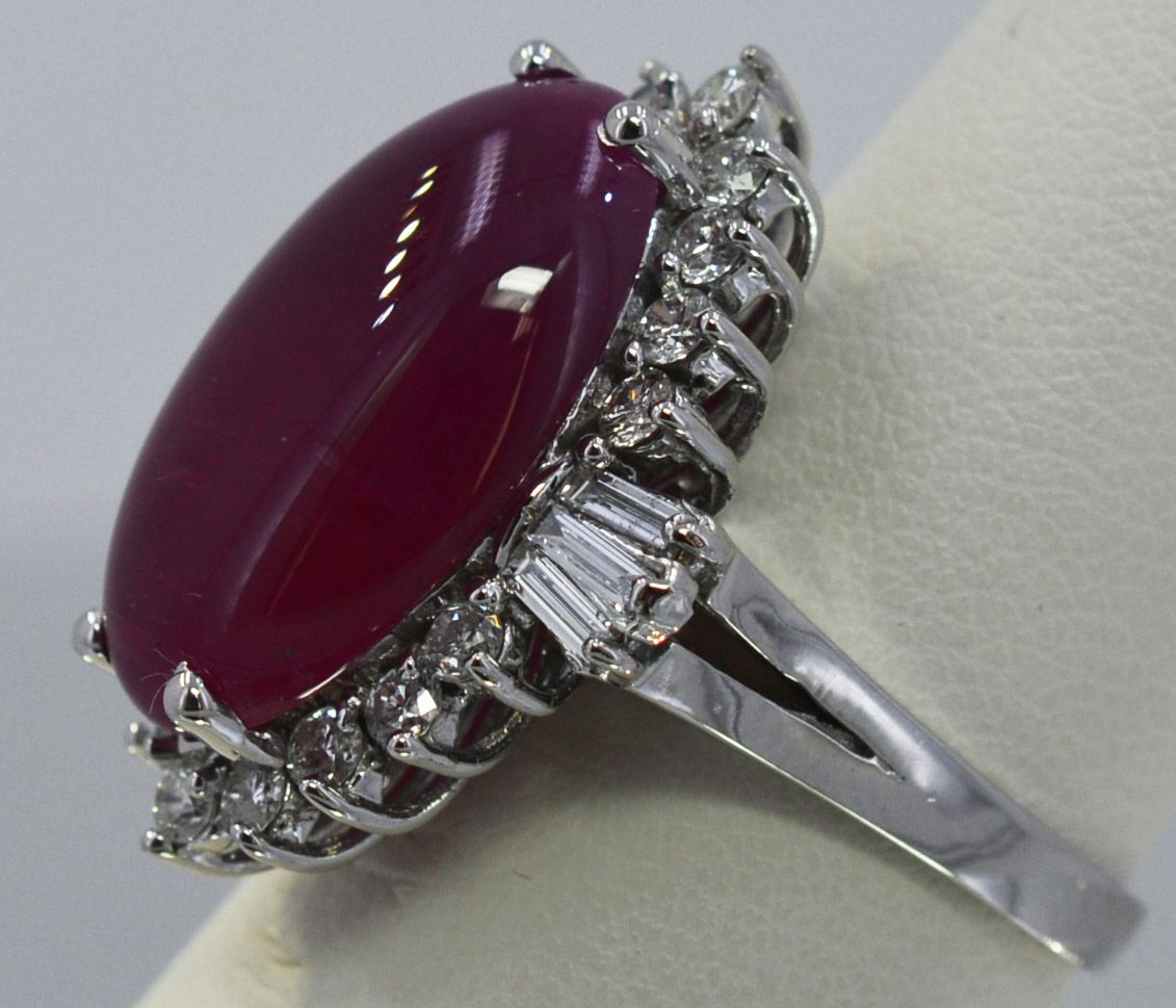14kt White Gold 5.06 Approx grams including, 11.48ct Cabochon Ruby (no lead) big oval cut, .84cttw Round and Baguette Diamond, Beautiful ring