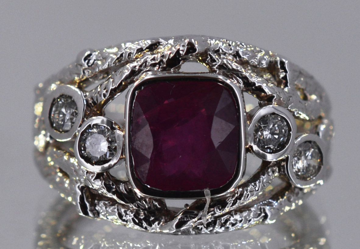 14kt White Gold 6.88 Approx grams including, 2.00ct Cushion Cut Ruby (no lead) Deep Red color, .22cttw Round Diamond G-H color VS-SI clarity
