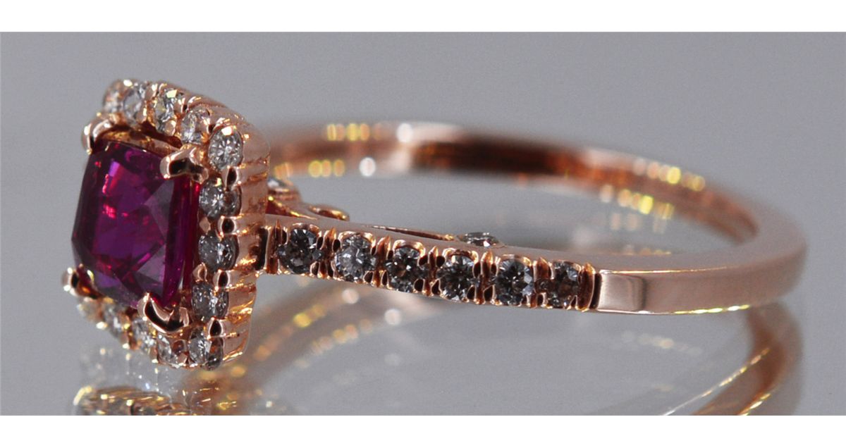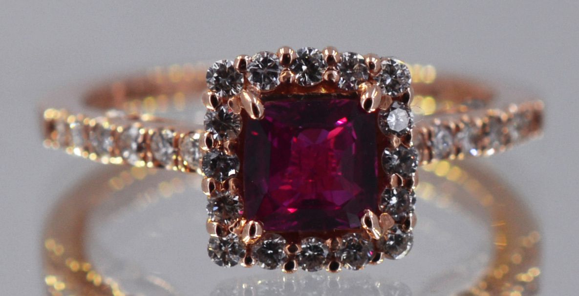 14kt Rose Gold 2.88 Approx grams including, .85ct Cushion Cut Ruby (no lead) Deep Red color, .50cttw Round Diamond G-H color VS-SI clarity