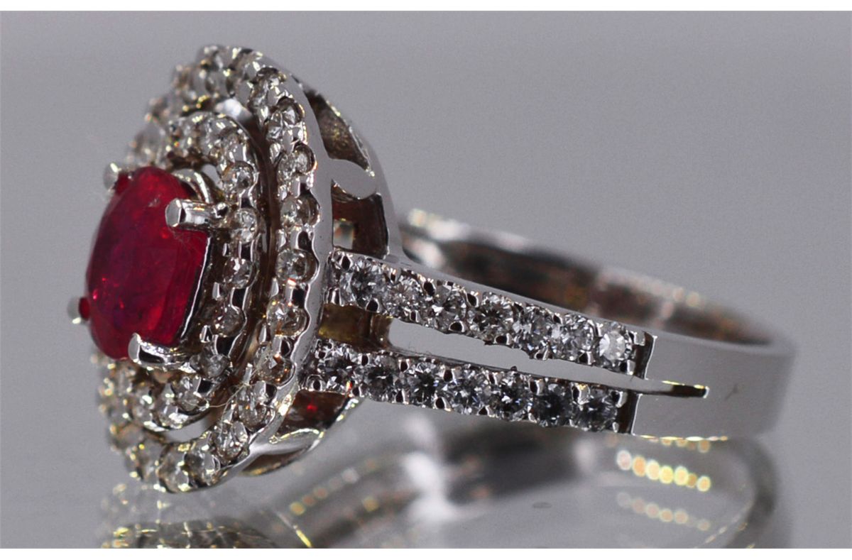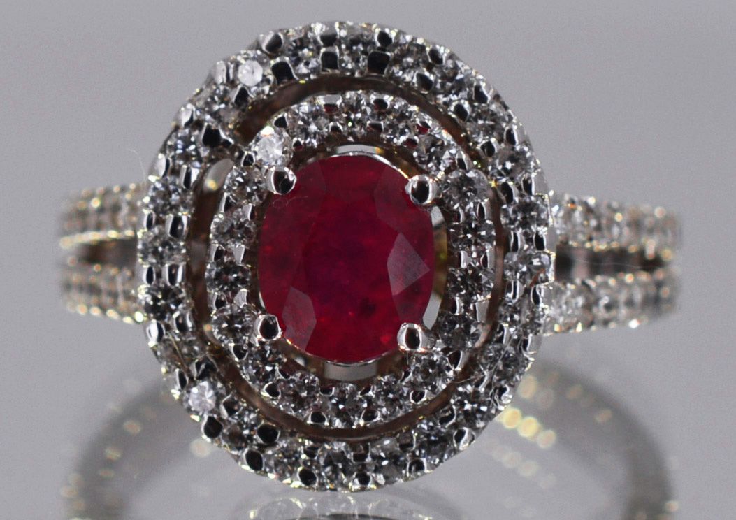 14kt White Gold 4.88 approx grams including, 1.00ct Oval Ruby (no lead) Deep red color, .79cttw Round Diamond G-H color VS-SI clarity