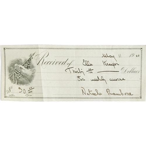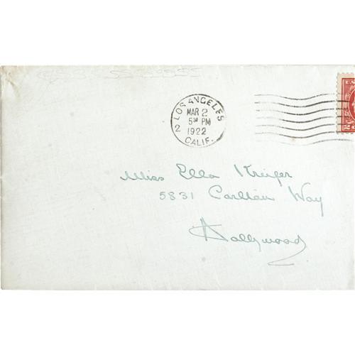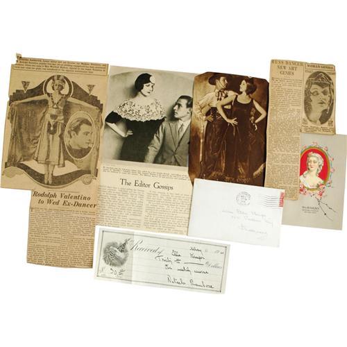 <B>Natacha Rambova Personal Items - Signed Receipt, Letter, Book and Newspaper/Magazine Clippings.</B></I> This intriguing packet of personal items from Rambova includes a receipt, dated May 11, 1920 and signed in full "Natacha Rambova;" a handwritten letter in green ink, dated March 1 and addressed to "My Dear Ella," mentioning <I>Salome</B></I> and signed "Sincerely, Natacha Rambova," with original envelope postmarked Los Angeles March 2, 1922; approximate 4" by 6" booklet on DuBarry perfume, with name "Richard Hudnut" engraved on cover (possibly Rambova's stepfather); and two newspaper and two magazine clippings, related to Rambova's relationship with Valentino. Very Good condition, especially for items that have somehow survived the past 80-plus years.<BR><BR><b>Shipping:</b> Flat Material, Small (<a target="_blank" href="http://www.heritageauctions.com/common/shipping.php">view shipping information</a>)