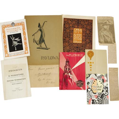 <B>Natacha Rambova Keepsakes: Six of her Play Programs, Plus Theodore Kosloff Signed Note and Items.</B></I> Natacha Rambova was an ardent theater-goer. She saved these programs from the 1920 and 1930s that have now survived her by over 50 years: souvenir program for legendary dancer Pavlowa, circa 1920, embossed cover, striking black and white photos and sketches; a 1922 Los Angeles Philharmonic Auditorium program for Pavlowa, 42 pages, with great vintage ads; <I>A Musical Galaxy</B></I> program, 1927, foreword by Leopold Stokowski, striking color sketches, 28 pages, includes "How the New Victor Records Are Made"; 1922 program for the "Orpheus Club" at the L.A. Philharmonic Auditorium; 1927 Los Angeles Grand Opera Association program, Shrine Auditorium, eight pages, dramatic photos; and <I>The Playgoer</B></I> program for a 1932 production of <I>Lysistrata,</B></I> staged at L.A.'s famous Carthay Fox Circle Theatre, the site of many gala Hollywood premieres (including <I>Gone With the Wind</B></I>). <I>The Playgoer</B></I> program has 23 pages and many great ads, including ones for the stage version of <I>Grand Hotel</B></I> then playing in L.A., and four full-page ads for Forest Lawn! Also included are several items related to Theodore Kosloff, Rambova's Svengali-like discoverer, who had shot her in the leg when she left him. These include a full Kosloff signature in pencil, as well as newspaper clippings and a concert program from the Al Malaikah Temple. This is a fascinating assortment of items, all in Very Fine condition.<BR><BR><b>Shipping:</b> Flat Material, Small (<a target="_blank" href="http://www.heritageauctions.com/common/shipping.php">view shipping information</a>)