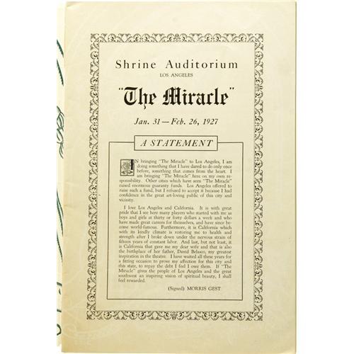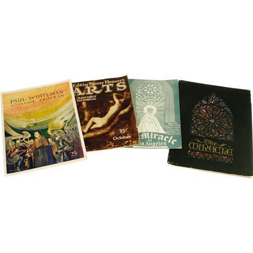 <B>Natacha Rambova's "Arts Monthly Pictorial Magazine" and Programs for Paul Whiteman's Orchestra and the Play "The Miracle."</B></I> From Rambova's own archive come these artifacts from the 1920s. First, <I>Edwin Bower Hesser's Arts Monthly Pictorial</B></I> from October 1926, with 48 pages of the famed photographer's semi-nude photographs of showgirls from the Ziegfeld Follies, Earl Carroll's Vanities and Hollywood (including a full page shot of scantily clad cult favorite Louise Brooks). Second, a deluxe program for Paul Whiteman's 1924-1925 transcontinental concert tour, with color cover and 21 pages devoted to Whiteman and his orchestra. Third, a 7" x 10" 48-page program for the Los Angeles production of the famous religious stage extravaganza <I>The Miracle,</B></I> with several pages of religious iconic art, great ads (including one for the Garden of Allah Hotel), the ticket order form with the Shrine Auditorium seating chart and a newspaper clipping about the unpaid actors in <I>The Miracle</B></I> attacking the box office for their salary! Fourth and finally, a stunning, 9" x 12" 40-page souvenir program for <I>The Miracle,</B></I> with color cover of religious stained-glass window, beautiful color reproductions of famed designer Norman Bel-Geddes' work, history of play, stories on Max Reinhardt and the play's creative staff, full-page "sectional view" of the mechanism that operated "the Miracle" itself, and much more. Wonderful examples of 1920s art and programs, and a peek into Rambova's personal tastes -- all in Excellent condition.<BR><BR><b>Shipping:</b> Flat Material, Small (<a target="_blank" href="http://www.heritageauctions.com/common/shipping.php">view shipping information</a>)