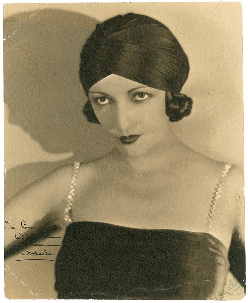 Ballerina, set designer, costume designer, actress, and second wife of Rudolph Valentino. She exhibited such control over his films that Paramount barred her from her husband’s sets; they divorced shortly afterward. Vintage matte-finish 10 x 12.5. Ball portrait of Rambova in a daring velvet sheath and turban, signed and inscribed in fountain pen, and also signed in green crayon in the lower right corner by the photographer. Photo is affixed to an identical size sheet of cardboard. In very good condition, with scattered creasing to corners and edges, most of which could be matted out. Pre-certified PSA/DNA and RRAuction COA.