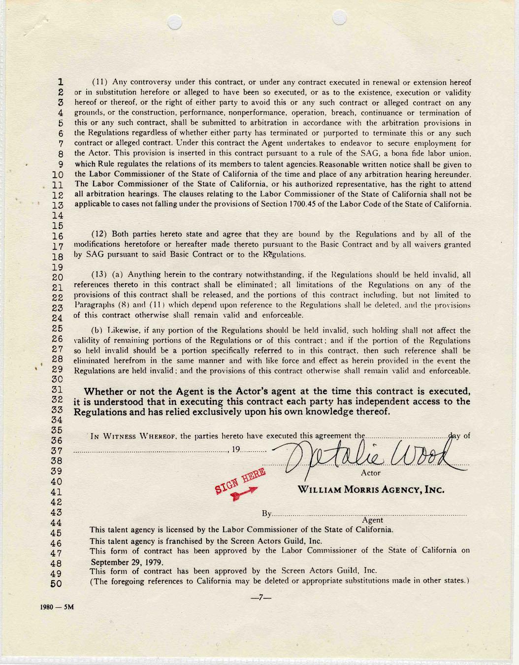 Contract signed by Natalie Wood with the William Morris Agency. Single signature page of contract is undated, though footnote of contract marks the year as 1980, about a year before her November 1981 death. Signature is very large and dark. Some staple holes in the upper left hand corner, else near fine conditon.