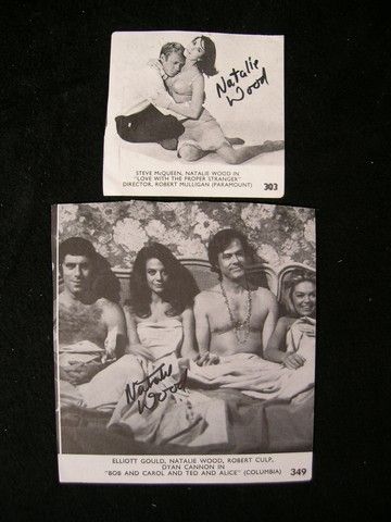 This is a lot of (2) autographed photo clippings from the late star Natalie Wood. One of the signed photos shows Ms. Wood and actor Steve McQueen in a scene from their 1963 comedy-drama 'Love with the Proper Stranger.' The other is a signed B&W photo from the controversial 1969 Paul Mazursky film 'Bob and Carol and Ted and Alice.' (measures approx. 3"x 3" and 5"x 5" respectively)