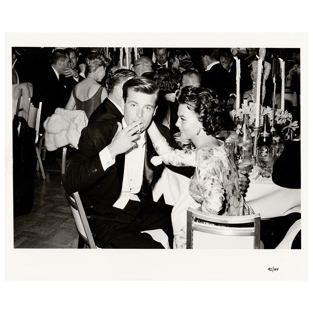 Limited edition 19.75 x 15.75 silver gelatin photograph of Natalie Wood and Robert Wagner together at a 1959 Oscar Dinner in Los Angeles. Blindstamped in the lower border by the estate of photographer Frank Worth, and numbered 42/195. In fine condition. Accompanied by a certificate of authenticity from the executor of the Frank Worth Estate.