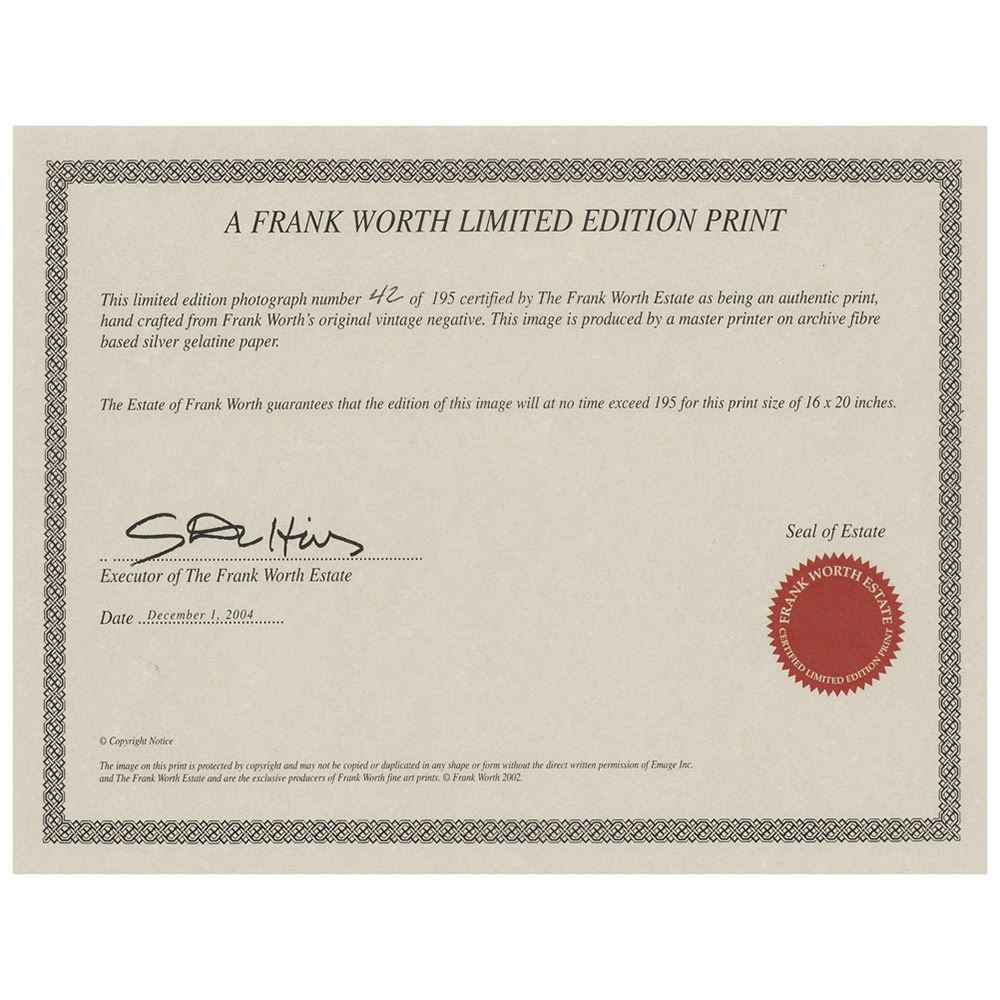 Sent to Hollywood as a staff photographer for the International News Service in 1940, 17-year-old Frank Worth quickly developed a unique rapport with the A-list celebrities he encountered. Transitioning from photographer to friend with relative ease, he spent over five decades capturing some of the most remarkable candid photos of Hollywood's elite, who typically only allowed carefully posed glamour portraits and publicity shots. Despite his own financial struggles, Worth valued the privacy of his famous friends above his potential earnings, and never exhibited these images during his lifetime. After his passing in 2000, a company was formed to finally publish his thousands of unseen images. This is one of the captivating images released by the Frank Worth Estate.
