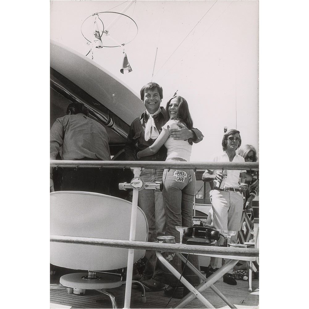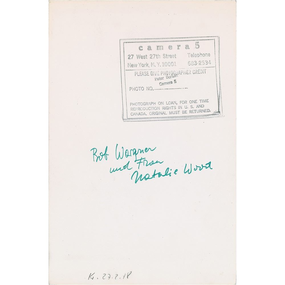 Original vintage matte-finish 7 x 10 silver gelatin photo of Natalie Wood and husband Robert Wagner together on a boat, bearing a "Peter Borsari/Camera 5" photographer's stamp on the reverse. In fine condition, with a trimmed left edge. From the Globe Photo archives.