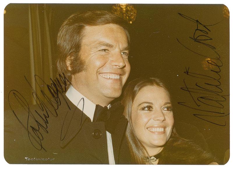 Color vintage satin-finish 4.75 x 3.5 candid photo of Wood and Wagner, signed in black felt tip, “Robert Wagner” and “Natalie Wood.” Reverse bears an ink notation of April 10, 1972, Beverly Hilton. In very fine condition.