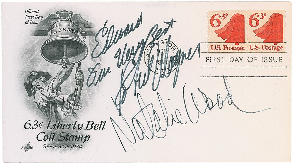 FDC with a cachet honoring the 6.3-cent Liberty Bell stamp, signed and inscribed in black felt tip “Edward, our very best, Robert Wagner,” and “Natalie Wood.” In fine condition, with a postmark under Wagner’s last name.