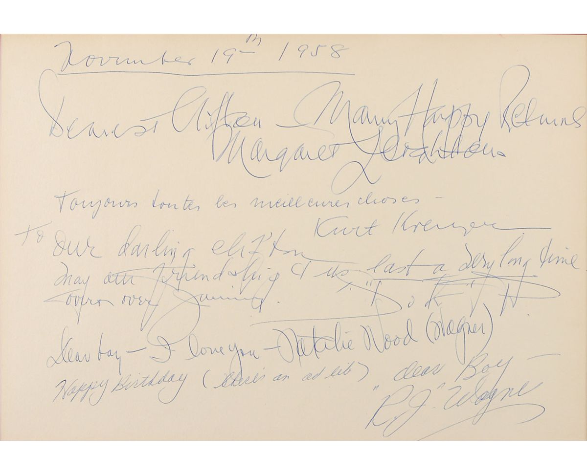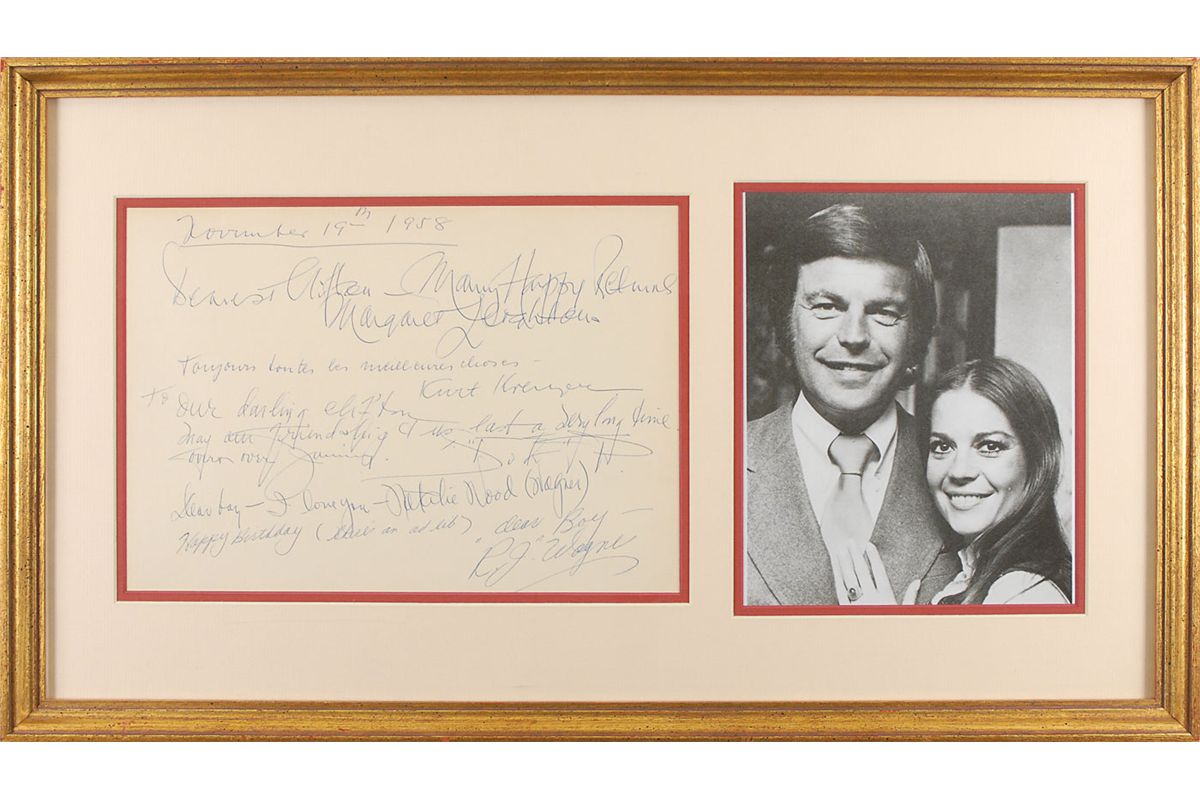 Vintage ballpoint signatures and inscriptions, “Dear boy—I love you—Natalie Wagner (Wood)” and “Happy Birthday (there’s an ad lib) dear boy—‘R. J’ Wagner,” on an off-white 11.75 x 8 sheet removed from actor Clifton Webb’s guest book. Also signed by actors Margaret Leighton and Kurt Kreuger, and dated November 19, 1958—Webb’s 69th birthday. Nicely double-matted and framed with a portrait of the Hollywood couple to an overall size of 25.5 x 14.5. In fine condition. Oversized.