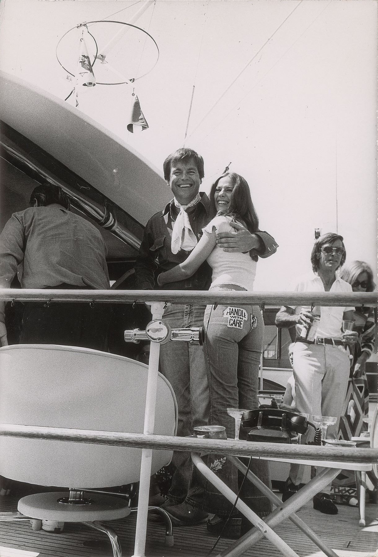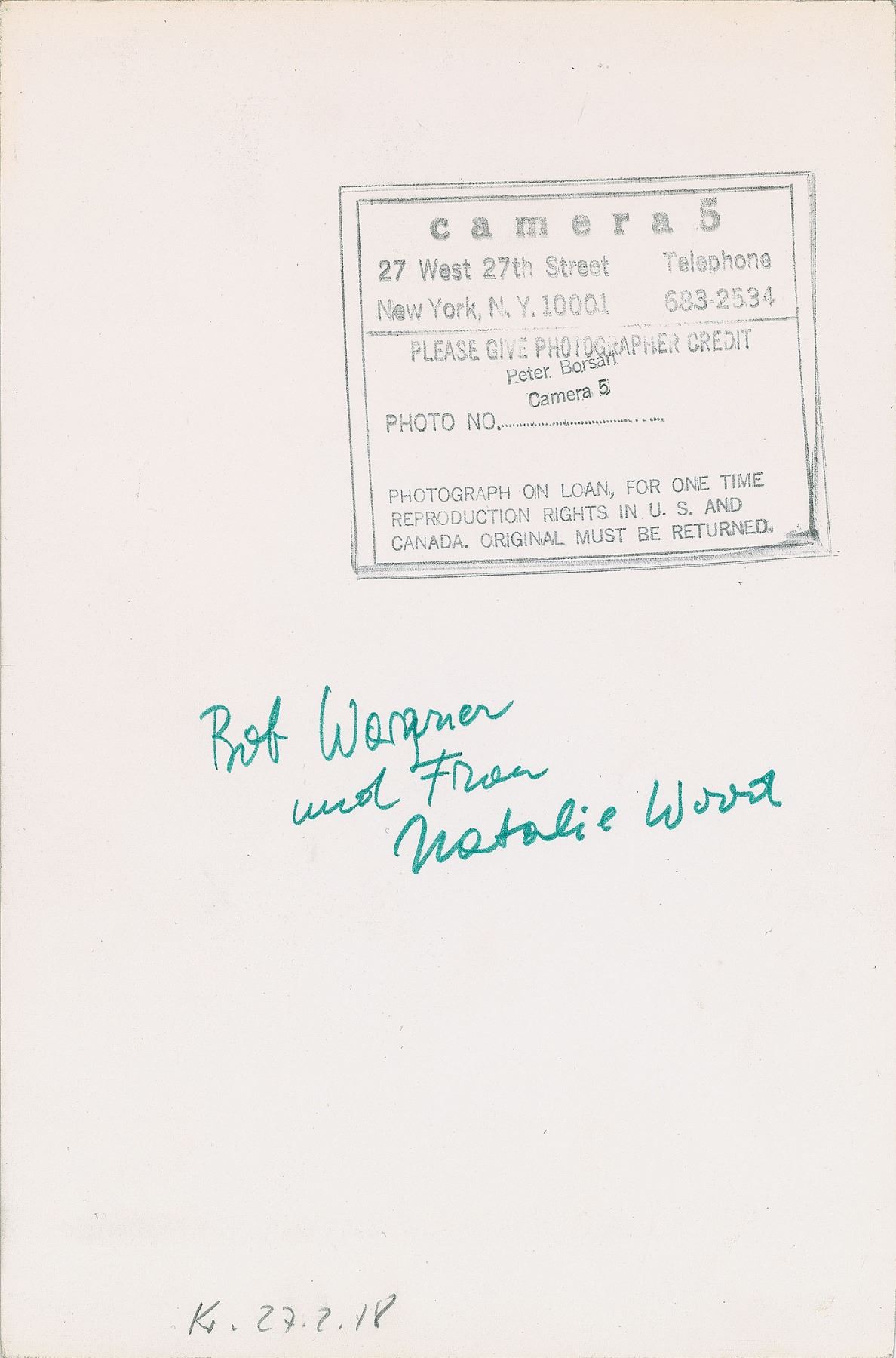 Original vintage matte-finish 7 x 10 silver gelatin photo of Natalie Wood and husband Robert Wagner together on a boat, bearing a "Peter Borsari/Camera 5" photographer's stamp on the reverse. In fine condition, with a trimmed left edge. From the Globe Photo archives.
