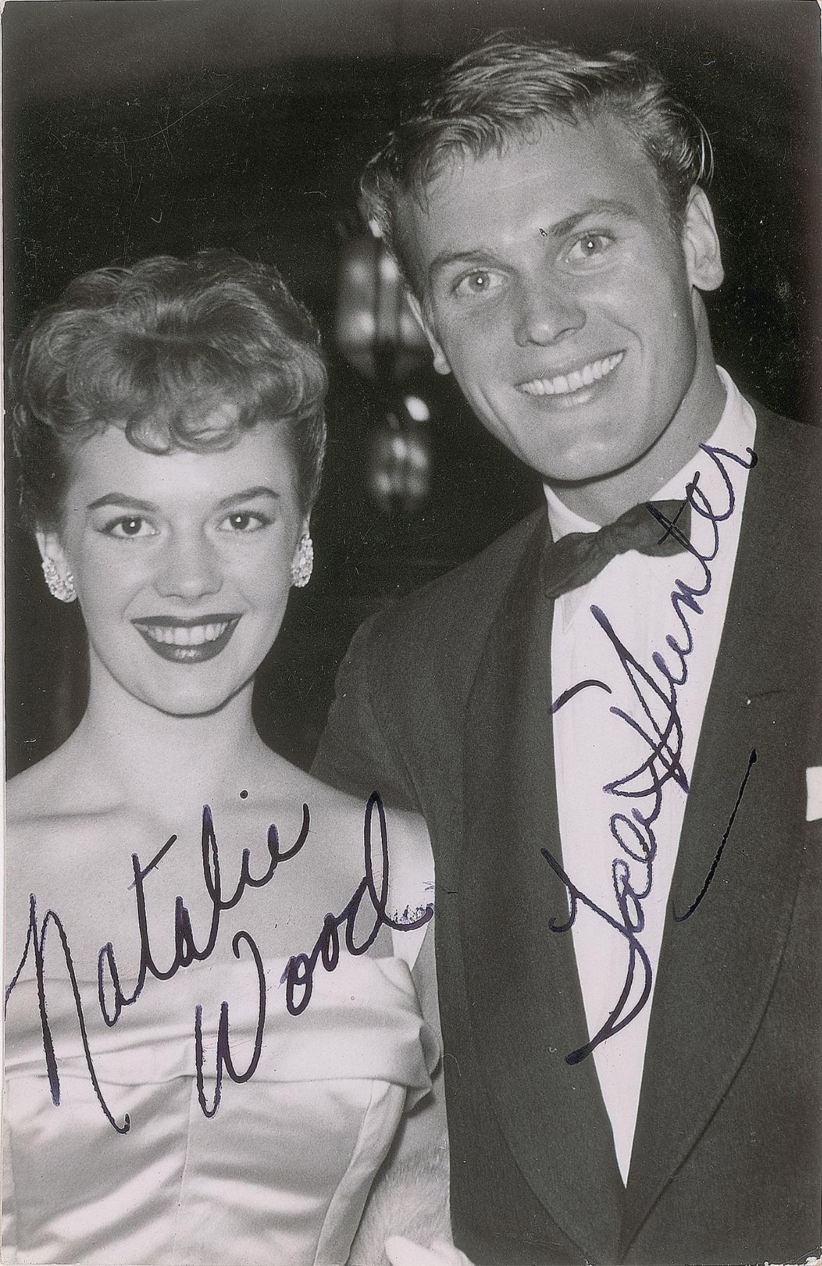 Wonderful vintage semi-glossy 3 x 4.75 half-length photo of Natalie Wood with fellow Warner Bros. star Tab Hunter at a black-tie ceremony, signed by both in fountain pen. In fine condition, with trimmed edges.