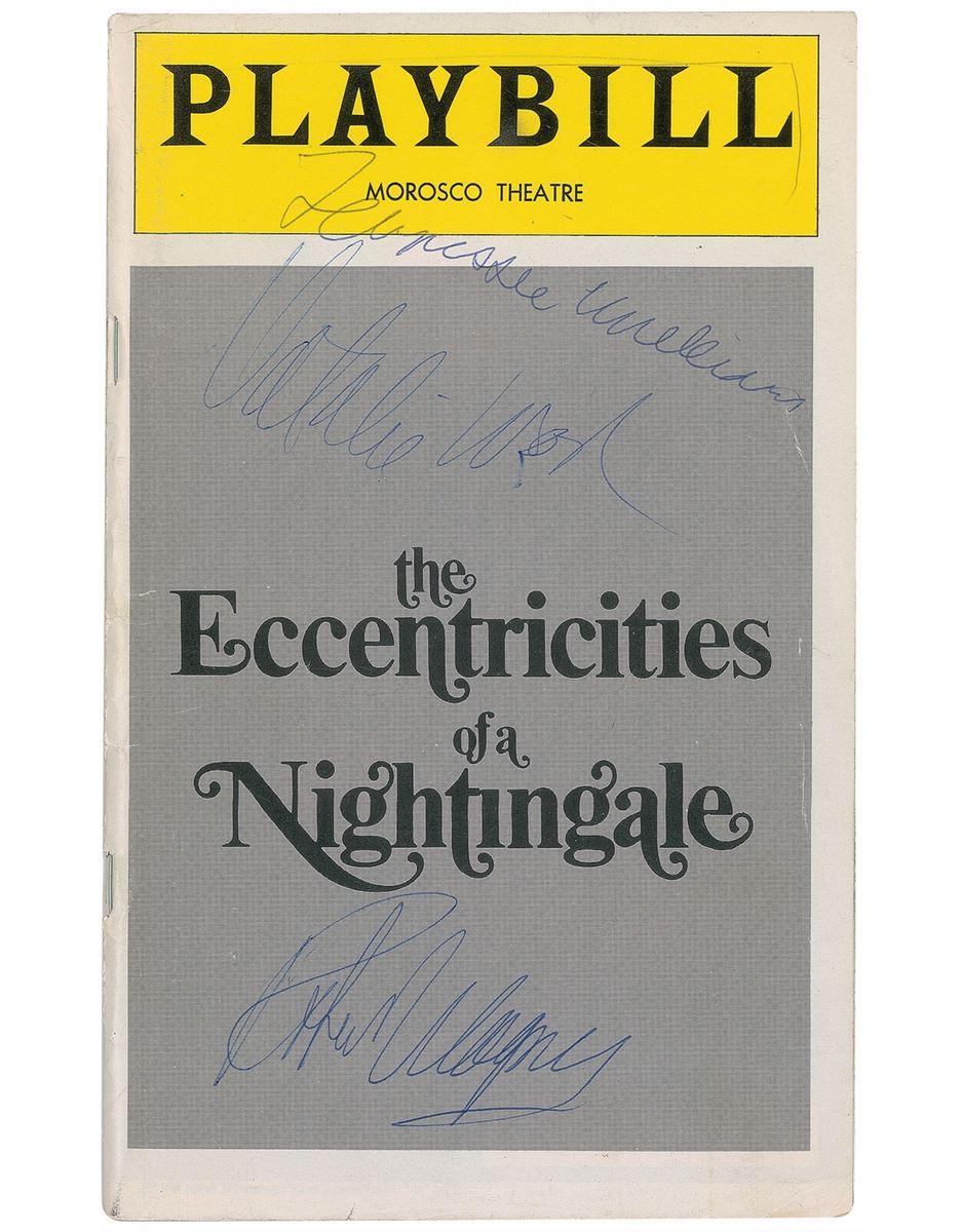 Playbill for the opening night performance of The Eccentricities of a Nightingale at the Morosco Theatre, November 23, 1976, 5.5 x 9, signed on the front cover in blue ballpoint by Natalie Wood, Tennessee Williams, and Robert Wagner. In fine condition, with light creases.
