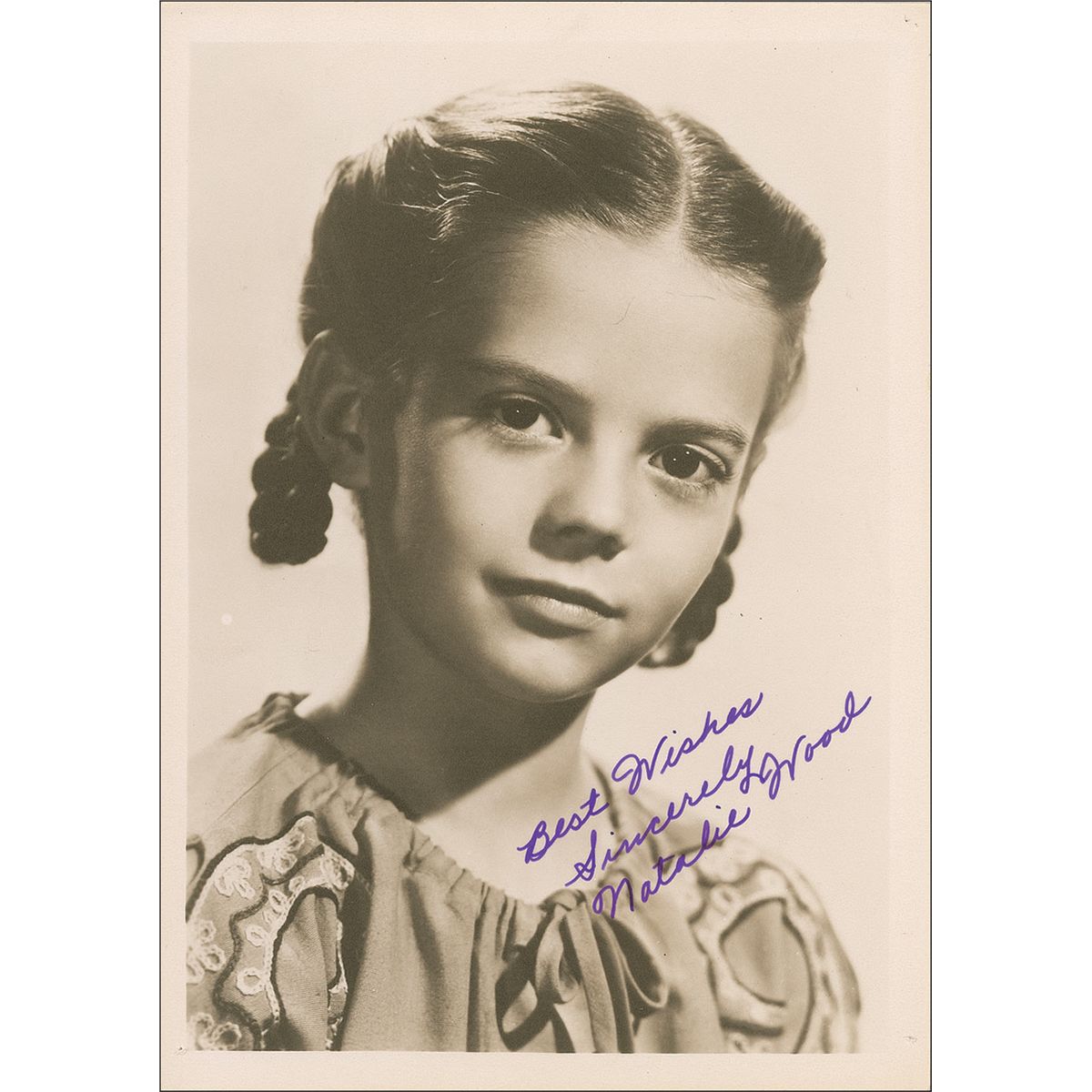 Charming vintage matte-finish 5 x 7 head-and-shoulders photo, signed in purple felt tip, “Best Wishes, Sincerely, Natalie Wood.” In fine condition, with small pin holes at three corners. An adorable image of a young Wood at the beginning of her Hollywood career.