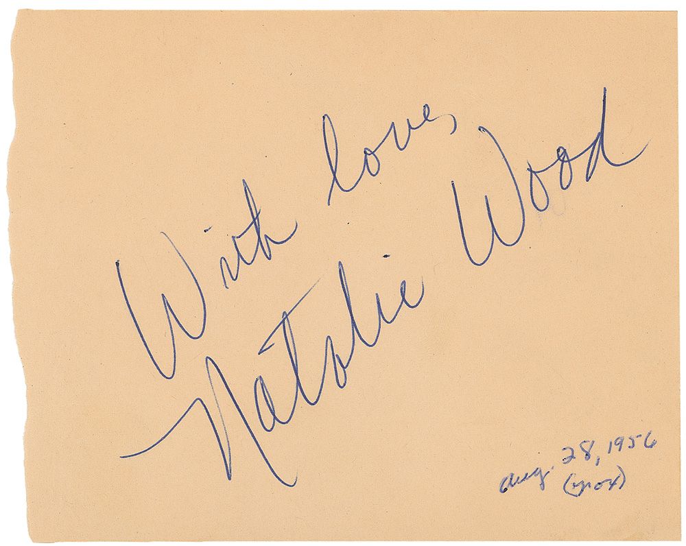 Vintage ballpoint signature, “With love, Natalie Wood,” on an off-white 5.25 x 4.25 album page, with a collector’s date notation of August 28, 1956, in the lower right corner. In fine condition.