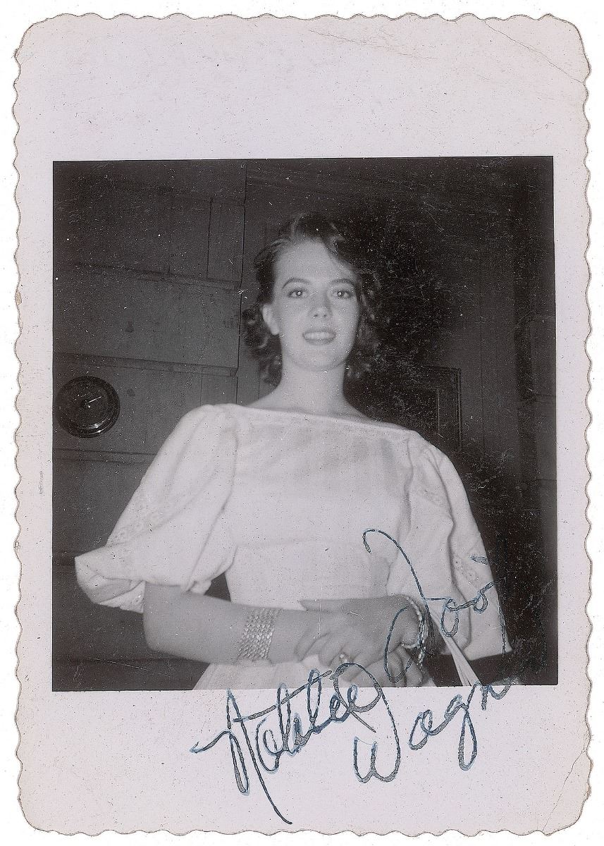 Sought-after vintage glossy 2.5 x 3.5 candid deckle-edge photo of Wood in a lovely half-length pose, signed in black ink, “Natalie Wood Wagner.” In fine condition.