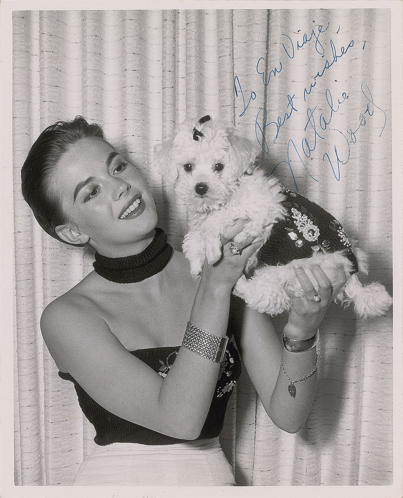 Vintage glossy 8 x 10 Warner Bros. publicity photo for the 1957 film Bombers B-52, showing Wood smiling and holding up a puppy, signed and inscribed in fountain pen, "To En Viaje, Best wishes, Natalie Wood.” Reverse bears a Warner Bros./Pat Clark credit stamp. In fine condition. Bombers B-52 was released in the UK as No Sleep till Dawn.