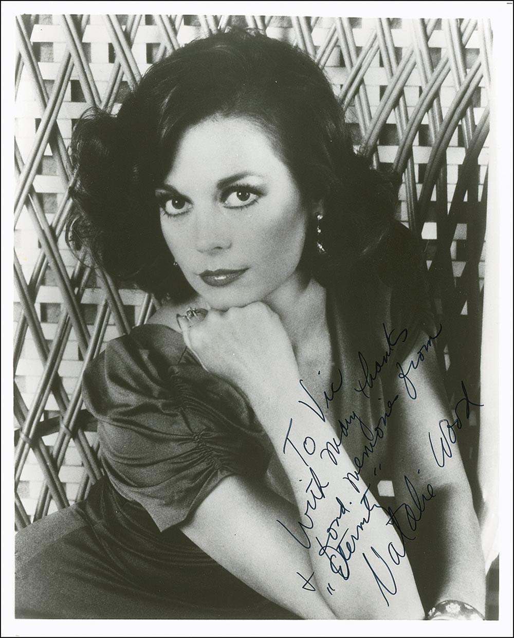 Glossy 8 x 10 photo of Wood in a wicker chair, signed and inscribed in black felt tip “To Vic, With many thanks & fond memories from ‘Eternity’ Natalie Wood.” Woods starred in the television adaptation of From Here to Eternity. In fine condition, with a few trivial surface impressions and a couple light creases. Pre-certified PSA/DNA and RRAuction COA.