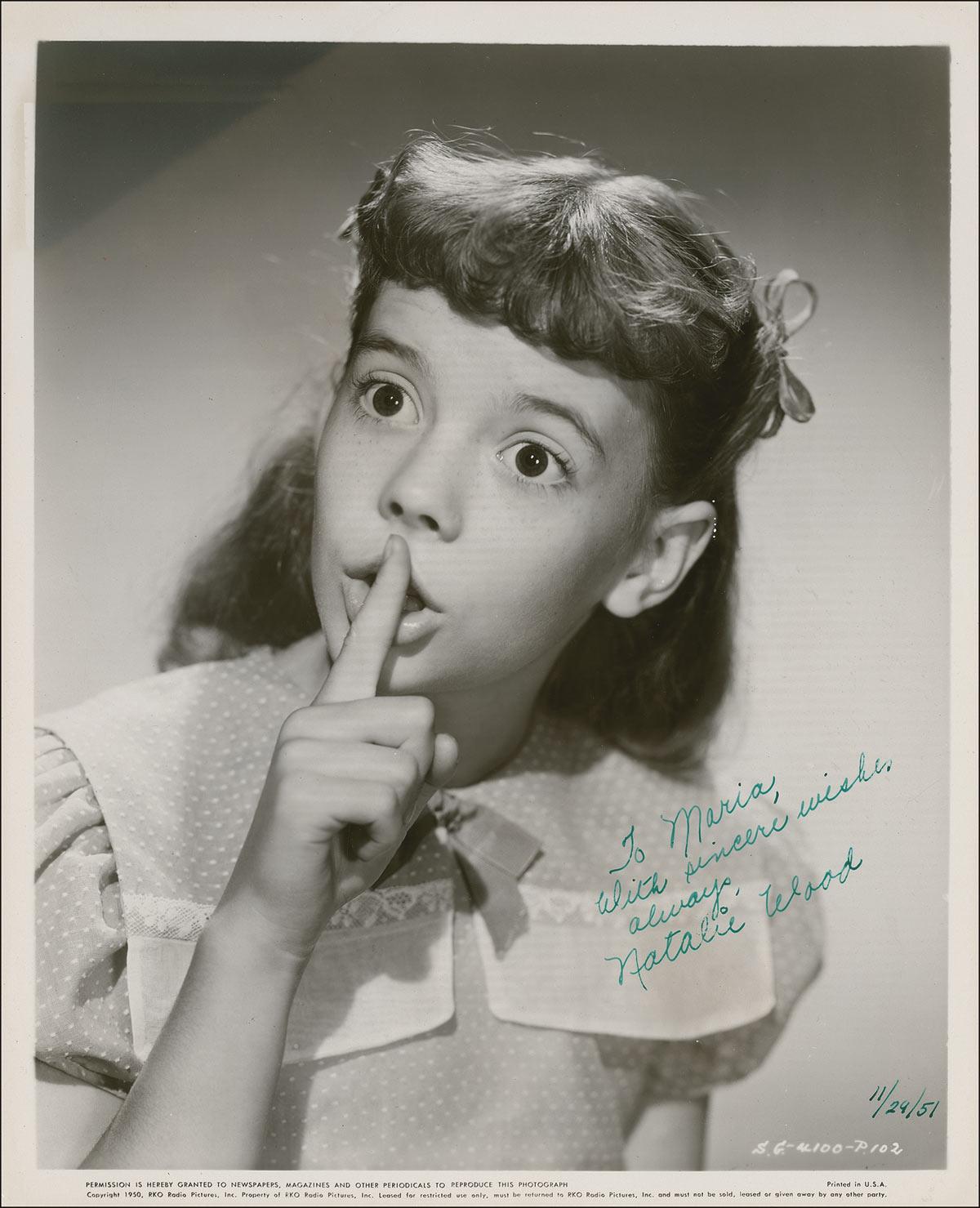 Cute vintage glossy 8 x 10 RKO Pictures publicity photo for the film Our Very Own, showing the 11-year-old Wood holding a finger to her lips, signed and inscribed in green fountain pen “To Maria, With sincere wishes always, Natalie Wood 11/29/51.” Promotional caption affixed to reverse. In fine condition, with a few scattered light creases and surface marks. An unusually early example.