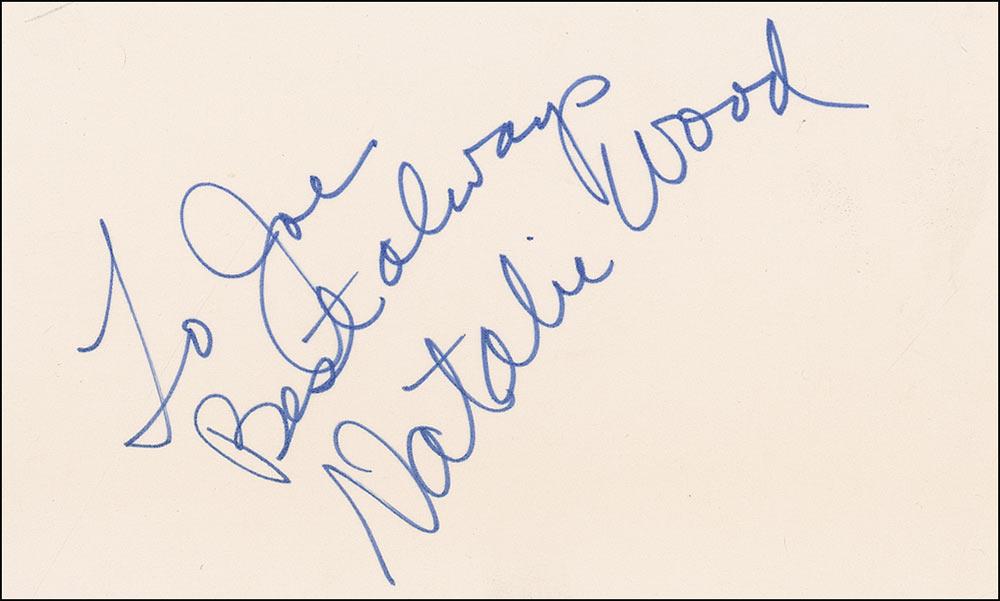 Excellent blue felt tip in-person signature and inscription, “To Joe, Best always, Natalie Wood,” on an off-white 5 x 3 card. In very fine condition.