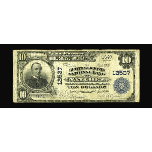 <B>Natchez, MS</B></I> - $10 1902 Plain Back Fr. 635 <B>The Britton & Koontz NB</B></I> Ch. # 12537<BR>This evenly circulated <B>Fine</B></I> is just the seventh $10 Plain Back to surface from this scarce bank, which was the only one of the three issuers located here to order the Plain Back design type. In the strongest market in human memory for scarce to rare Nationals, we expect this better note will reach...