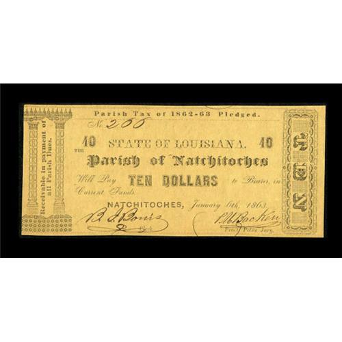 <B>Natchitoches, LA- Parish of Natchitoches</B></I> $10 Jan. 6, 1863 <BR> A lovely example from this none too common Parish. <B>Uncirculated,</B></I> ex-Rareshide collection sale, where it was lot 1144, realizing $690. <BR><I>From The Collection of a Louisiana Gentleman.</B></I><BR><BR><b>Shipping:</b> Coins & Currency (<a target="_blank" href="http://www.heritageauctions.com/common/shipping.php">view shipping information</a>)